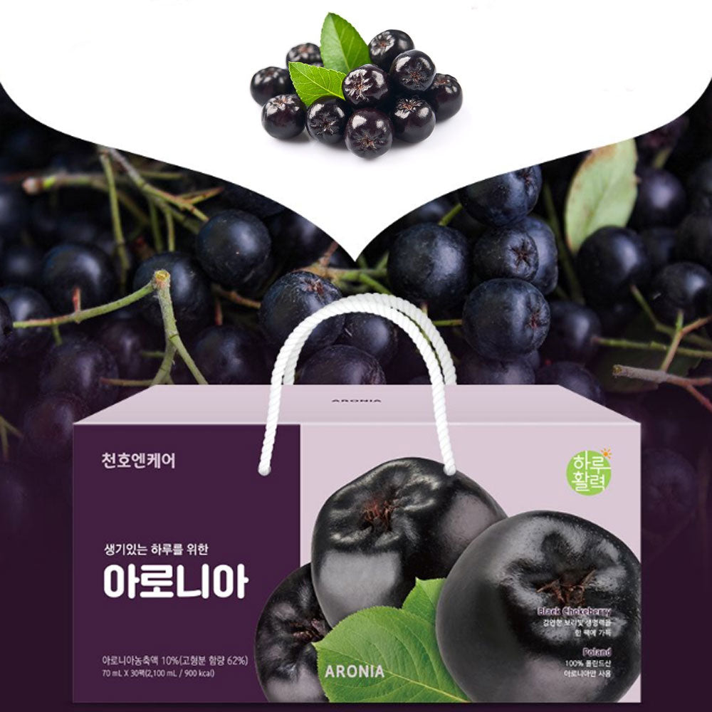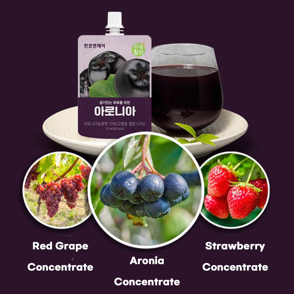 Enjoy a fresh, vibrant start to your day with Chunho Ncare Aronia Juice—crafted with 333 whole aronia berries in every box. This juice features a special golden ratio blend of Polish aronia, red grape, and strawberry, delivering a rich source of polyphenols, anthocyanins, flavonoids, and catechins for antioxidant support.
