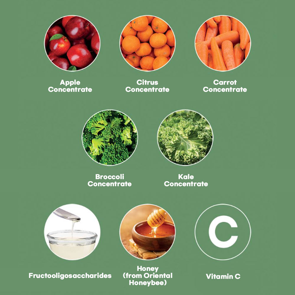 Includes broccoli, kale, apple, carrot, oligosaccharides, and more.